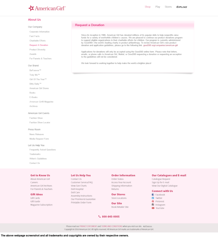 American Girl’s product donation program gives to organizations that focuses on children ages 6-12 for fundraising purposes only. Appropriate fundraisers include auctions and raffles. Toy drives are not eligible for donations. They do not donate to schools, though PTOs and PTAs may still apply, as well as children’s hospitals and youth sports.