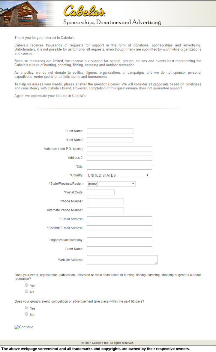 Cabela’s is excited for the opportunity to give back to local non-profit organizations. Donations are in the form of merchandise and in rare circumstances in the form of Cabela’s gift cards.