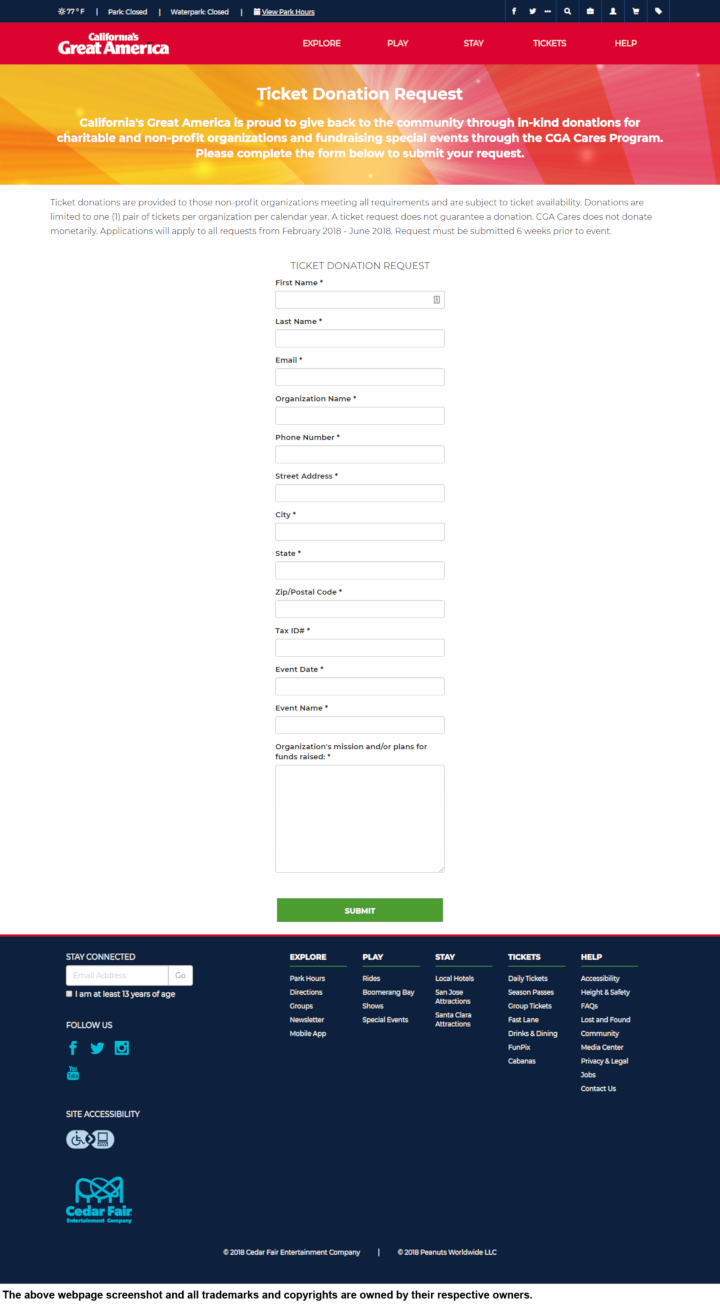 California’s Great America gives in-kind donations for charitable / non-profit organizations, and fundraising special events. Donations are a pair of tickets to the park.