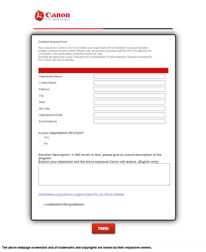 3. Documentation requirement: Nonprofit organizations must provide written documentation in the form of a Tax Acknowledgement of Donation under Internal Revenue Code Section 170(F)(8) form, which is provided by Canon U.S.A., Inc.