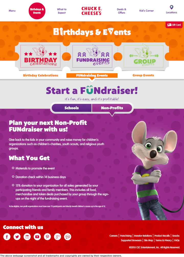 Chuck E. Cheese’s values corporate citizenship. They give back and help organizers to raise money for a children’s organization such as schools, children’s charities, youth scouts, and religious youth groups.