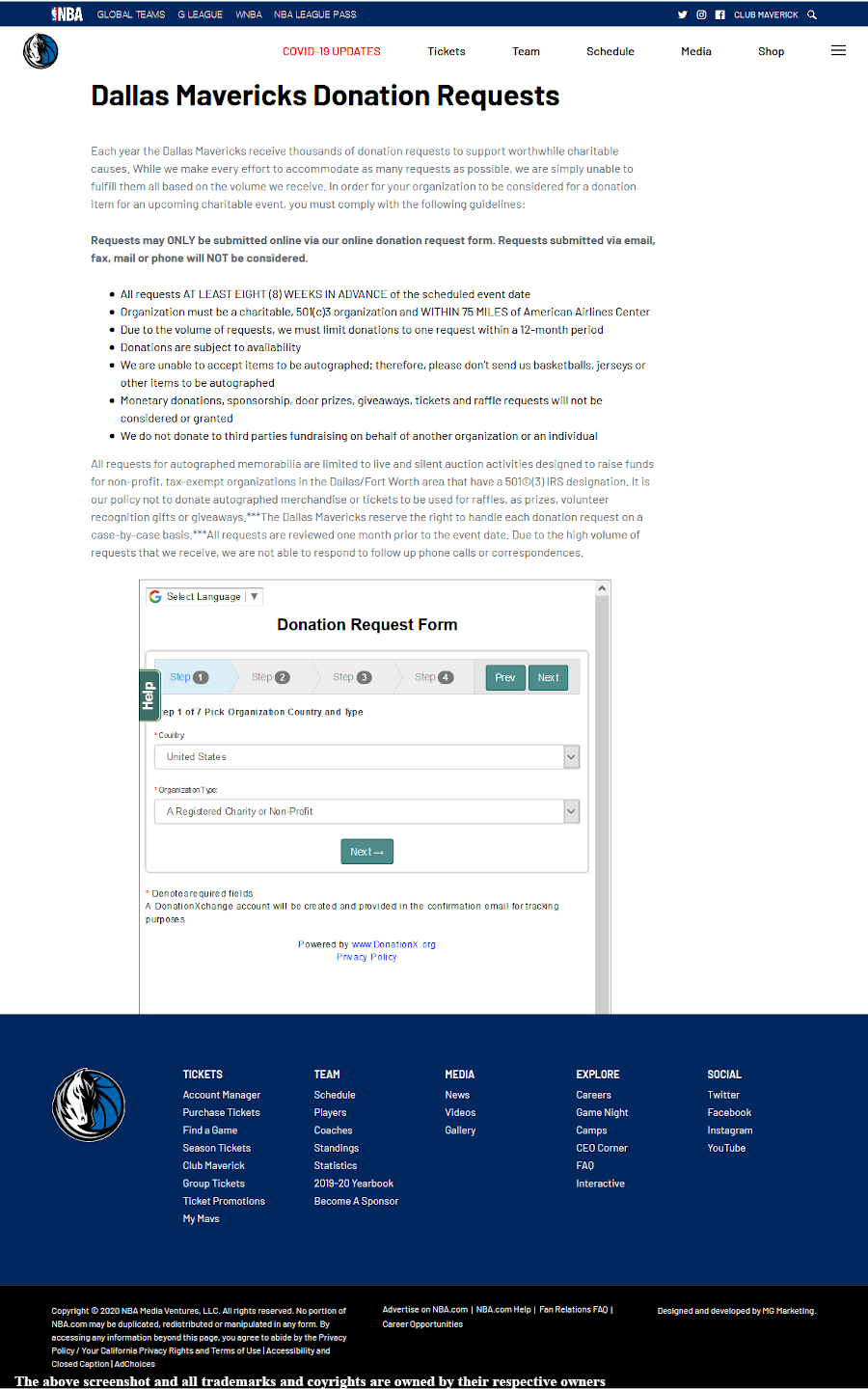 Submit the Dallas Mavericks’ online donation request form at least 8 weeks before the event donations are needed for. Requests are limited to once ever 12-month period.