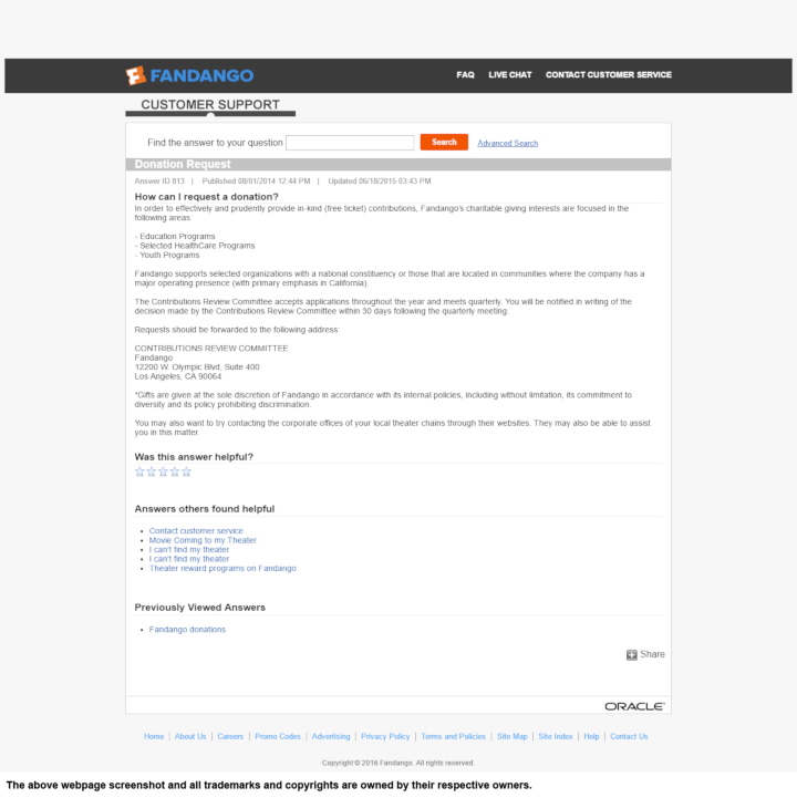 Through in-kind (free ticket) donation, Fandango loves to give back to the communities where their company has a major operating presence. Currently this is mainly California. They support community programs that focus on education, health care, and youth.