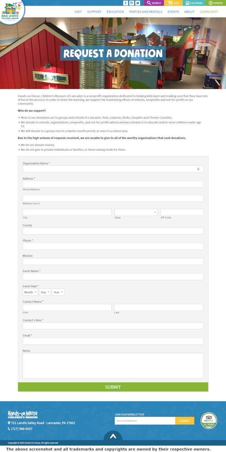 Hands-on House, Children’s Museum of Lancaster donates to schools and nonprofit organizations that serve children who are age 10 or under. Donations are only made to organization in Lancaster, York, Lebanon, Berks, Dauphin and Chester Counties. Only one donation per year will be made to a specific organization. Monetary requests will not be fulfilled. Submissions are not accepted from individuals.