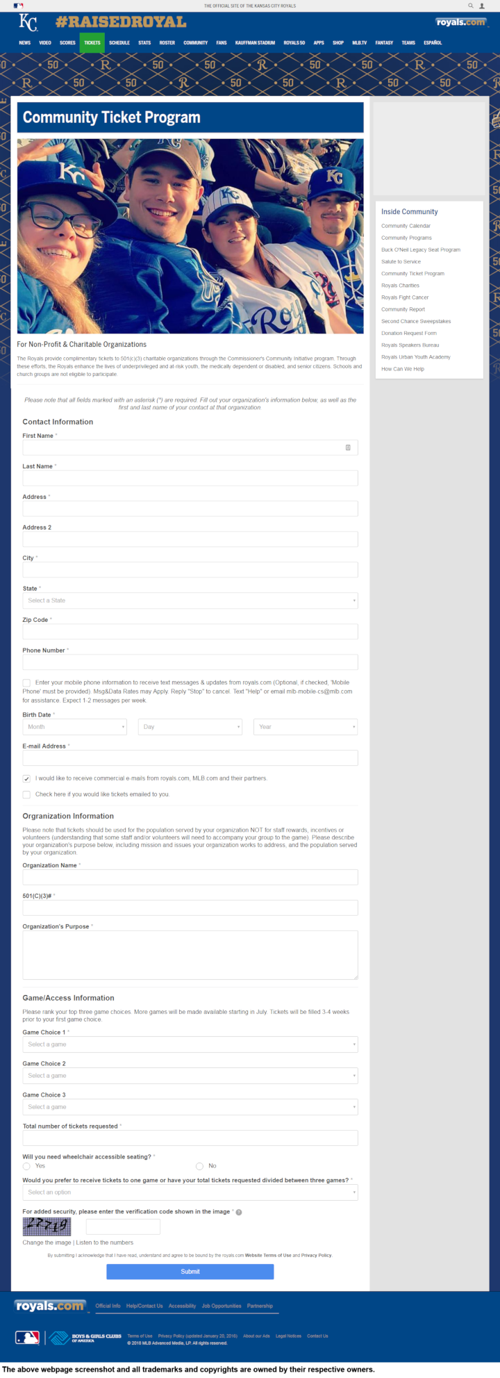 The Kansas City Royals provide complimentary tickets to 501(c)(3) charitable organizations.