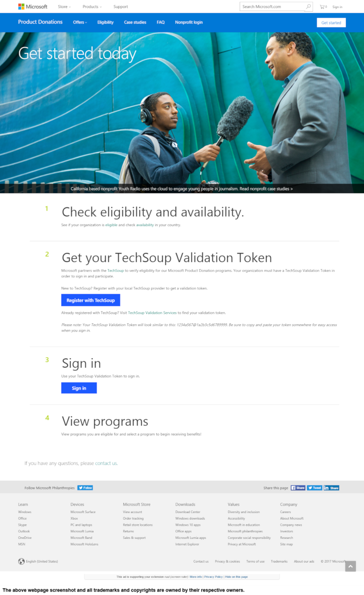 After you check eligibility and availability, you can submit your donation request through online. Your organization must have a TechSoup Validation Token in order to sign in and participate.