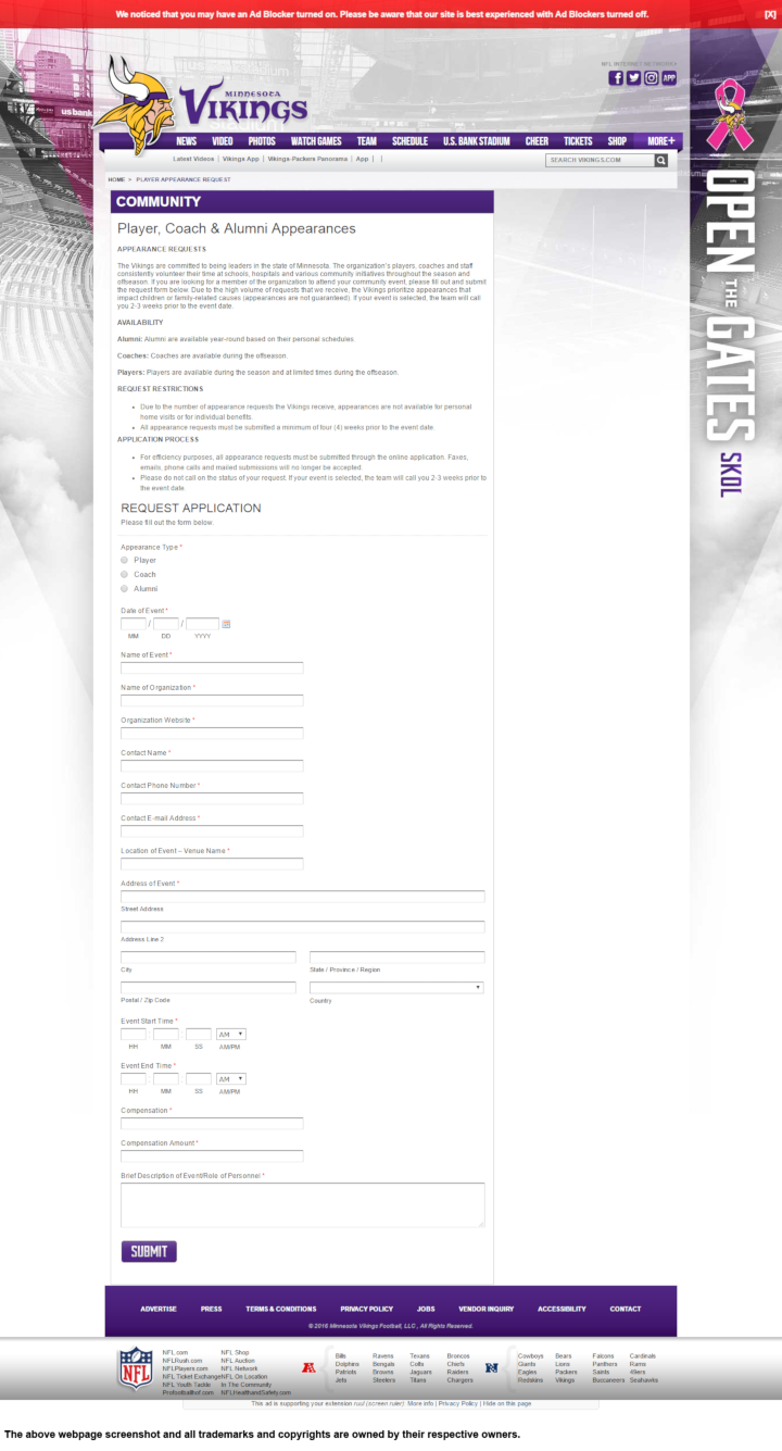 The Minnesota Vikings are committed to giving back to their community. Their players, coaches, alumni and staff volunteer their time at schools, hospitals and various community events during both the season and off-season.