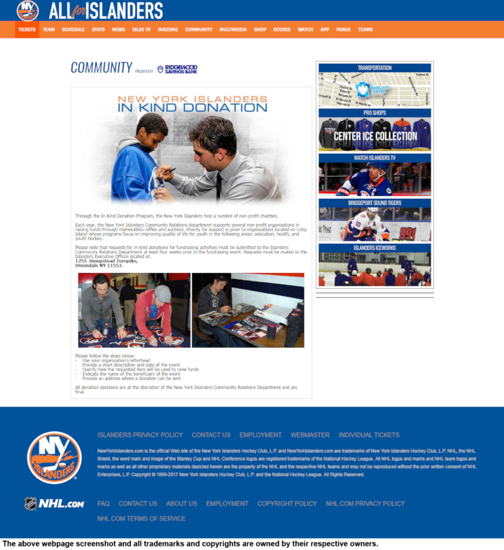 The New York Islanders help non-profit charities through their In-Kind Donation Program. Their Community Relations Department supports organizations raising funds through memorabilia raffles and auctions. Priority is given to Long Island organizations who focus on: education, health, and youth hockey.