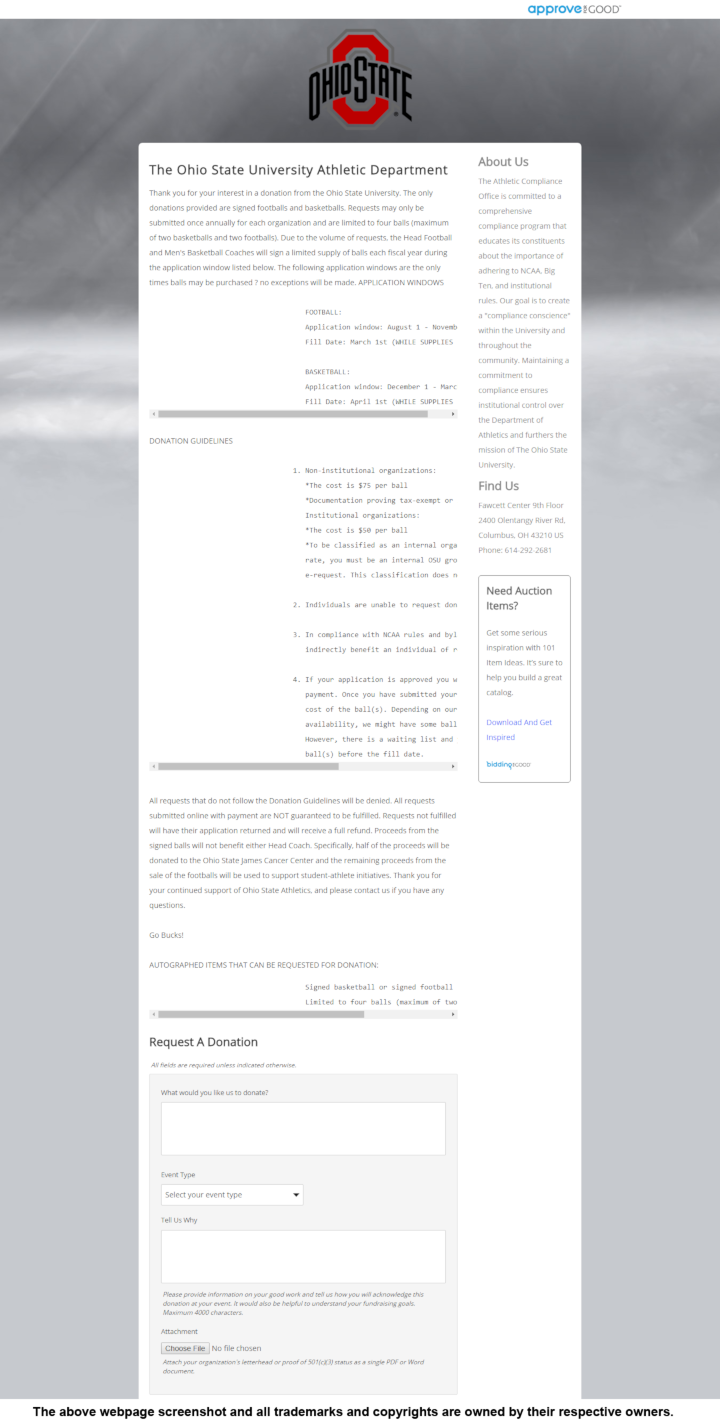 Be reminded that with thousands of donation requests each year, the Head Football Coaches will only sign a limited supply of balls each fiscal year during the application window (August 1 – November 30). Basketball Coaches have a similar short window (December 1 – March 31).
