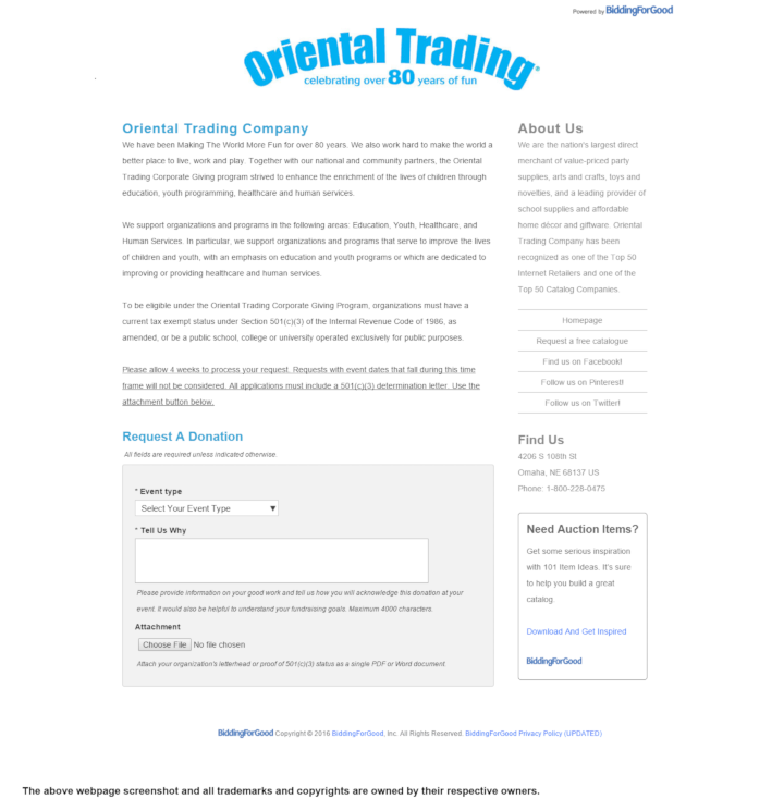 To be eligible under the Oriental Trading Corporate Giving Program, your organization must hold a valid tax-exempt status under Section 501(c)(3) of the Internal Revenue Code of 1986. Once eligible, you can submit your donation request conveniently through their online form. To ensure ample time for consideration, it is recommended to submit your request at least four weeks prior to the scheduled event date. Embrace the opportunity to partner with Oriental Trading Company and bring joy, support, and enrichment to your community.