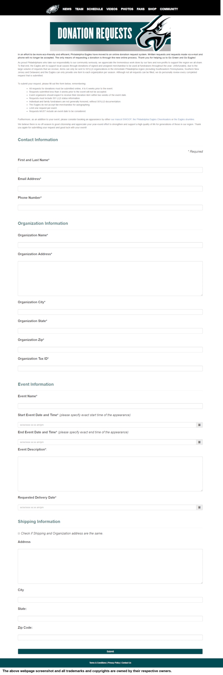 Philadelphia Eagles are proud to serve their community by supporting 501(c)(3) organizations in the Philadelphia region. They support local causes through donations of signed and unsigned merchandise to be used at fundraisers