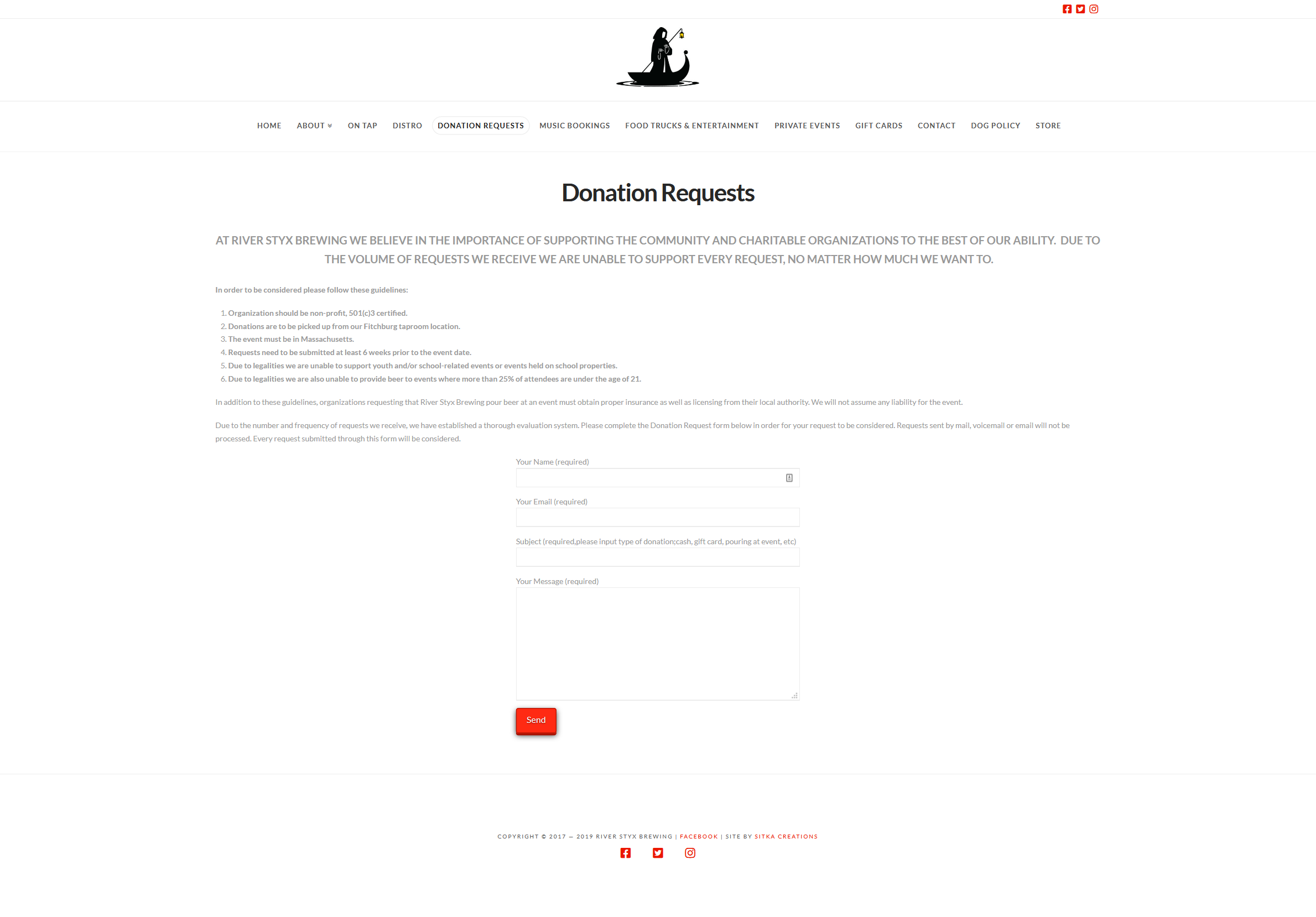 River Styx Brewing supports 501(c)(3) events that are held within Massachusetts. In-kind donations include products to a beer pour at the event.