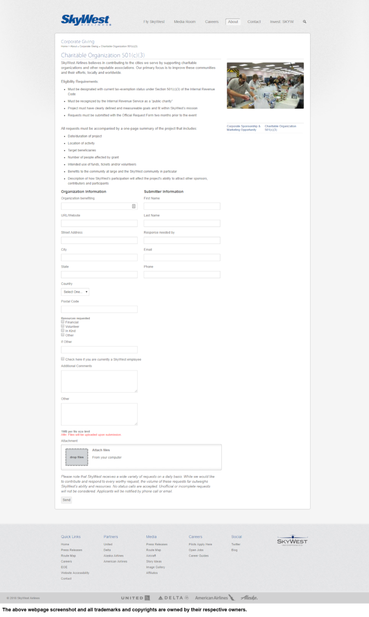 3. One-Page Project Summary: Along with the Official Request Form, organizations should include a one-page summary of the project. This summary should include details such as the date and duration of the project, location, target beneficiaries, the number of people affected by the grant, and the intended use of funds, tickets, and/or volunteers. Additionally, organizations should highlight the benefits of SkyWest’s participation to the community and explain how SkyWest’s involvement will attract other sponsors, contributors, and participants.