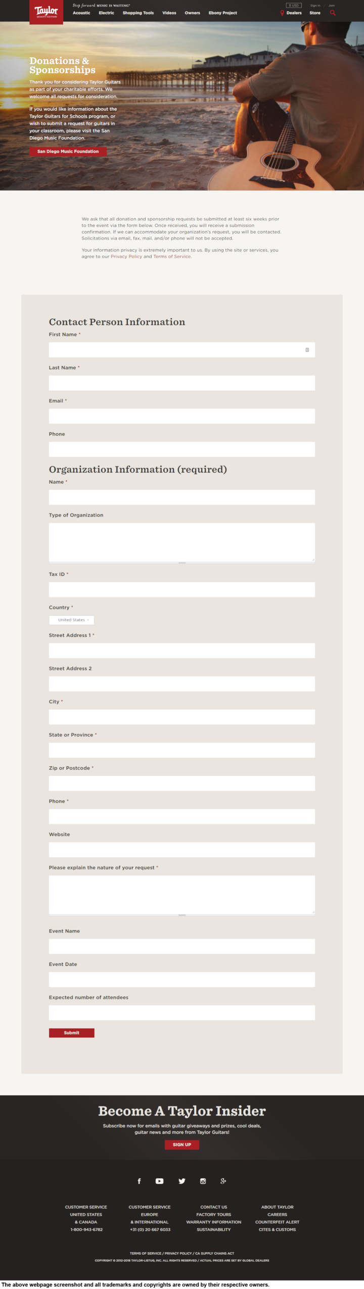 Taylor Guitars is dedicated to supporting various organizations and charities and considers other charitable causes when possible. To initiate a donation request, organizations must submit their requests online at least six weeks before the desired date of support.