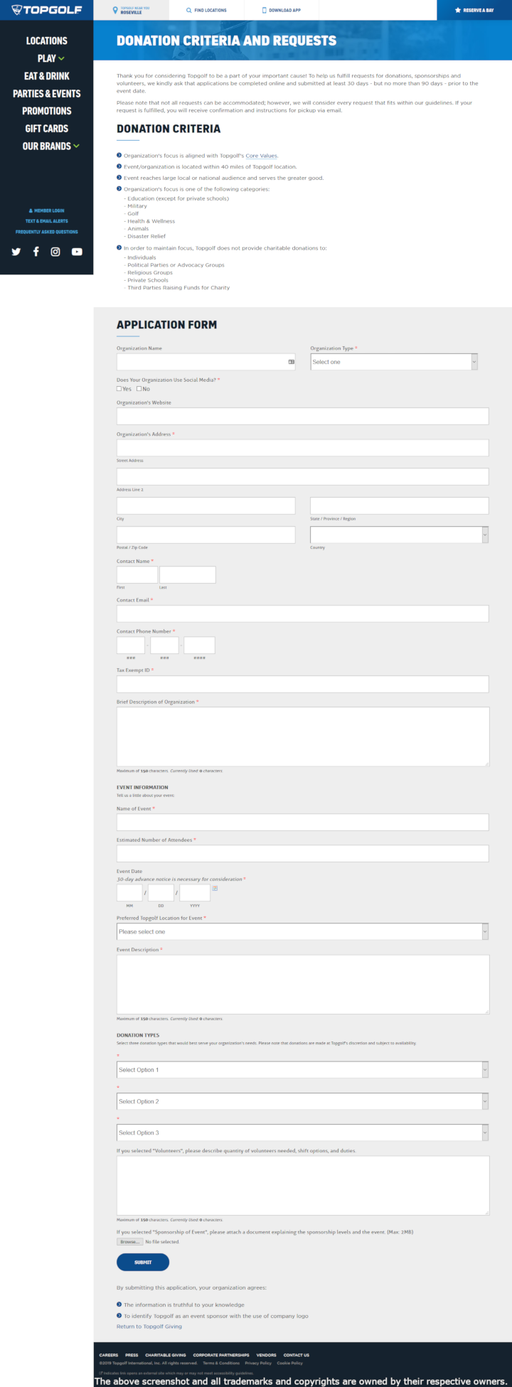 TopGolf donates to organizations within 40 miles of one of their locations. They choose organizations that focus on public education, military, golf, health/wellness, animals, and disaster relief. Organizations/events need to reach a large local or nation audience.