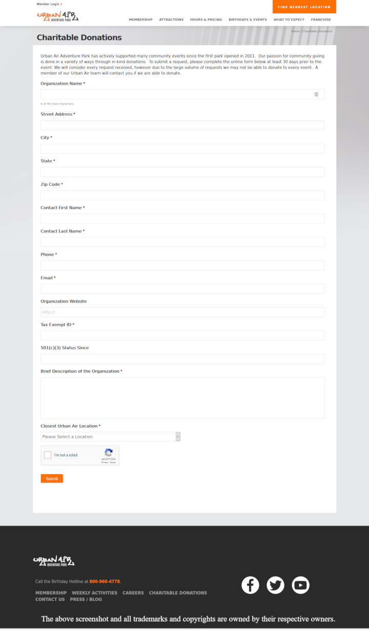 Donation requests must be submitted via Urban Air’s online form. Include information about your organization/event, what type of donation is wanted, and contact info. Submit the form with 30 days or more lead time from your organizations event. Urban Air will contact you if your request has been granted.