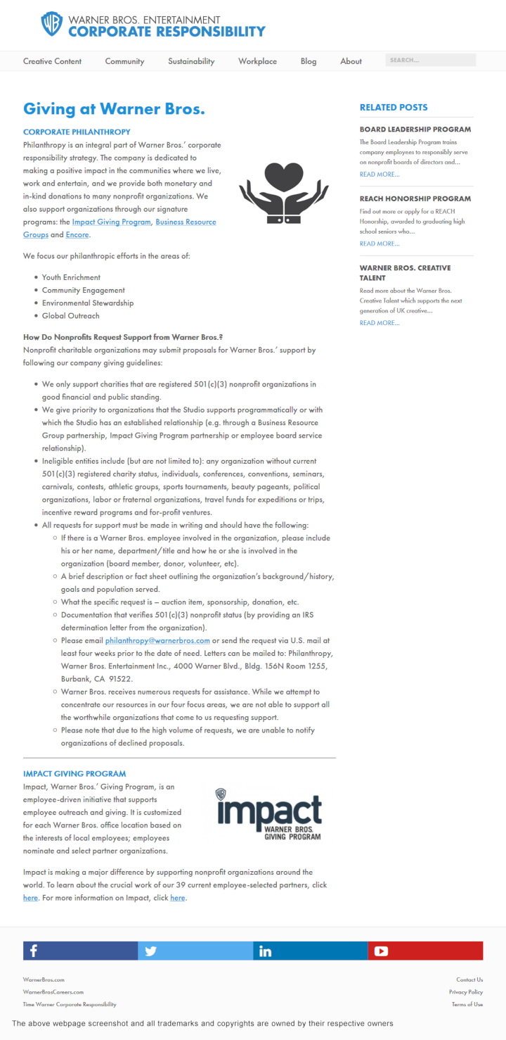 Warner Bros.’ is committed to making a positive impact in the communities where they live, work and entertain. They provide both monetary and in-kind donations to different nonprofit organizations that focuses on: